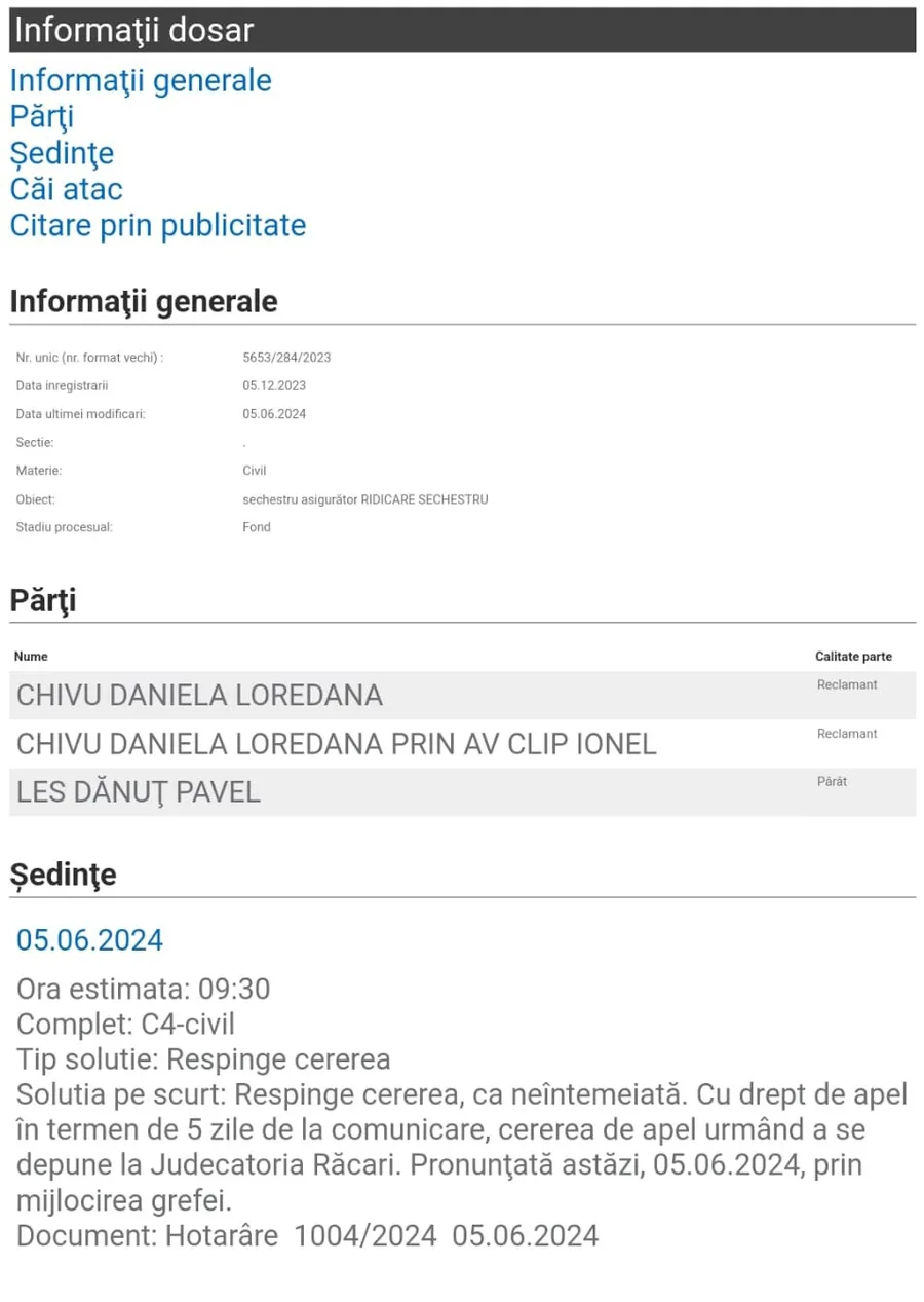 Magistrații de la Judecătoria Răcari au respins cererea Loredanei Chivu ca neîntemeiată, iar contestația poate fi făcută în termen de cinci zile, începând de pe 5 iunie 2024, când a fost comunicată soluția.