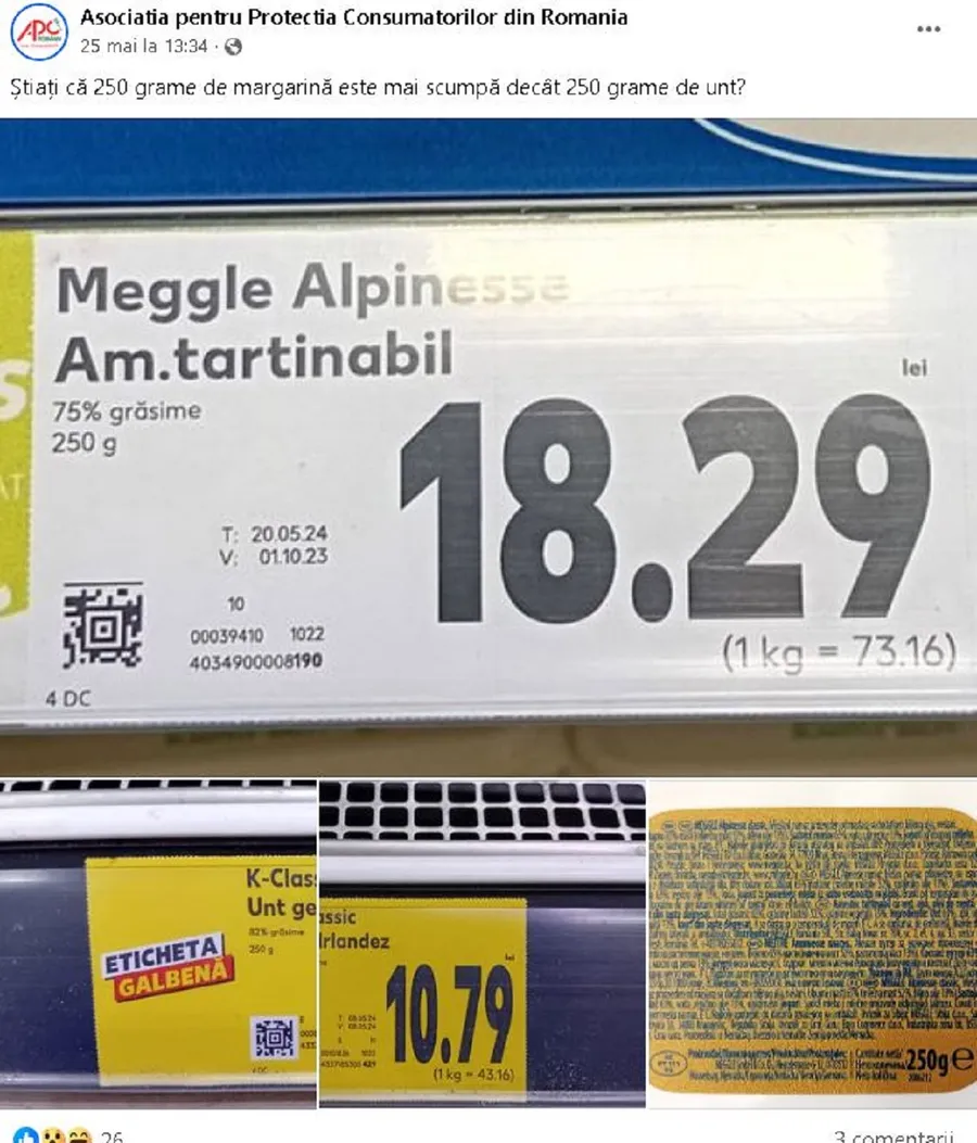 În atenția clienților, diferențele de preț au fost semnalate de către Protecția Consumatorilor din România. Pe pagina personală de Facebook a instituției, reprezentanții au făcut comparația direct de la raftul supermarketului: ”Știai că 250 de grame de margarină este mai scumpă decât 250 de grame de unt?”, se arată în mesajul ANPC.