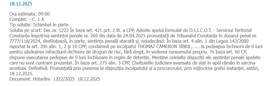”Solutia pe scurt: Dec.nr. 1222 În baza art. 421 pct. 2 lit. a CPP, Admite apelul formulat de D.I.I.C.O.T. – Serviciul Teritorial Constanţa împotriva sentinţei penale nr. 269 din data de 24.04.2025 pronunţată de Tribunalul Constanţa în dosarul penal nr. 7777/118/2024, desfiinţează, în parte, sentinţa penală atacată şi, rejudecând: În baza art. 4 alin. 1 din Legea 143/2000 raportat la art. 396 alin. 1, 2 şi 10 CPP, condamnă pe inculpatul THOMAZ CAMERON JIBRIL, …. la pedeapsa închisorii de 9 luni pentru săvârşirea infracţiunii de?inere de droguri de risc, fără drept, în vederea consumului propriu. ?n baza art. 60 CP, dispune executarea pedepsei de 9 luni închisoare în regim de detenţie. Menţine celelalte dispoziţii ale sentinţei penale apelate care nu sunt contrare prezentei. În baza art. 275 alin. 3 CPP, Cheltuielile judiciare avansate de stat în apel rămân în sarcina acestuia. Definitivă. Pronunţată prin punerea la dispoziţia inculpatului şi a procurorului, prin mijlocirea grefei instanţei, astăzi, 18.12.2025”.