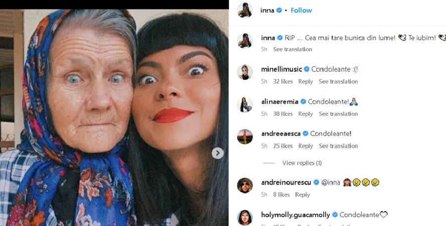 „RIP …. Cea mai tare bunică din lume! Te iubim!„, a scris Inna, pe pagina sa de Instagram. Fanii și-au exprimat regretul și i-au transmis artistei condoleanțe. Acum, artista se pregătește să-și conducă bunica pe ultimul drum.