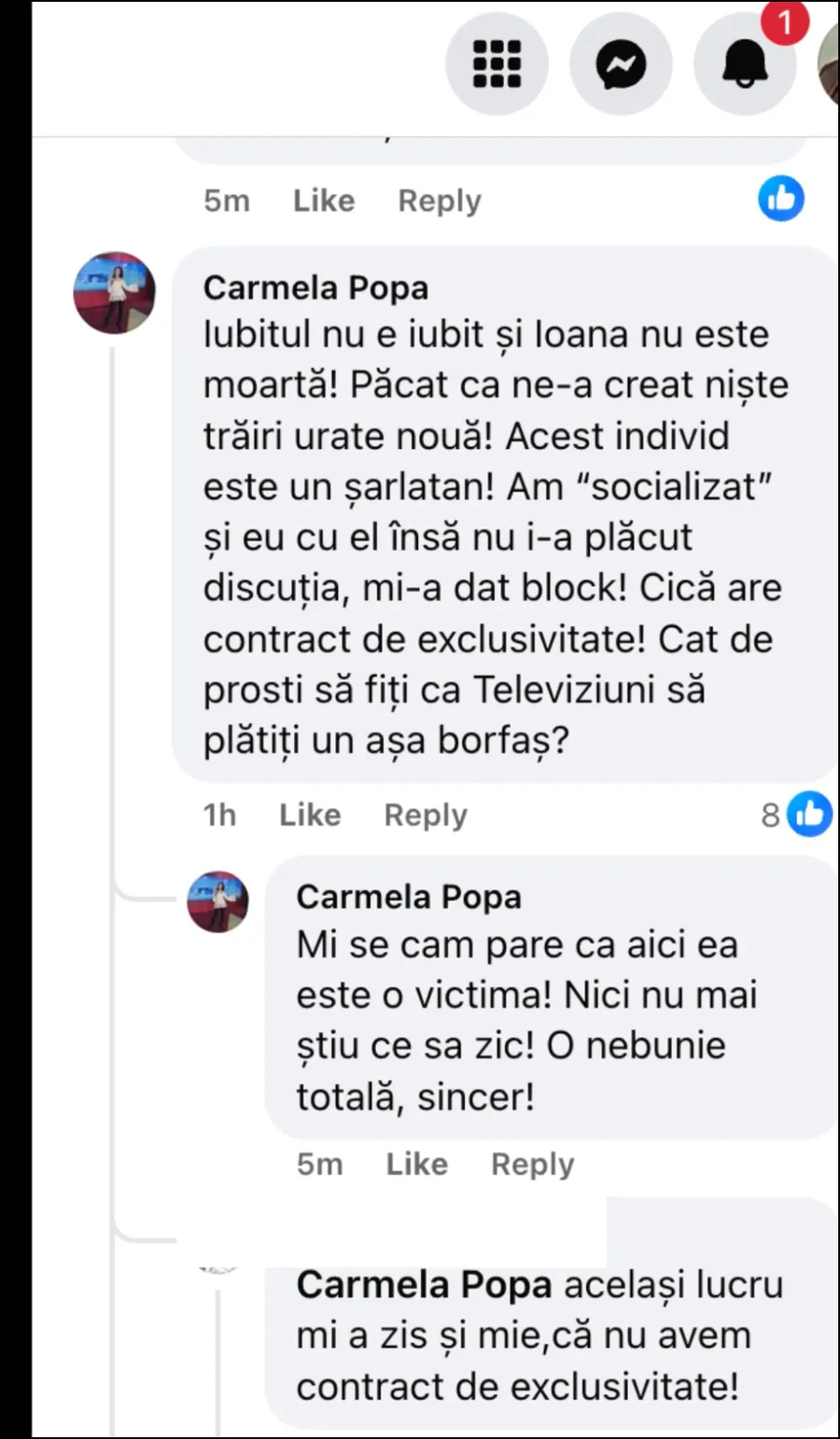 „Iubitul nu e iubit și Ioana nu este moartă! Păcat că ne-a creat niște trăiri urâte nouă! Acest individ este un șarlatan! Am ‘socializat’ și eu cu el, însă nu i-a plăcut discuția, mi-a dat block! Cică are contract de exclusivitate! Cat de proști să fiți ca televiziuni să plătiți un așa borfaș? Mi se cam pare ca aici ea este o victima! Nici nu mai știu ce sa zic! O nebunie totală, sincer!”, a scris Carmela Popa, în secțiunea de comentarii a unei postări despre moartea Ioanei Popescu.