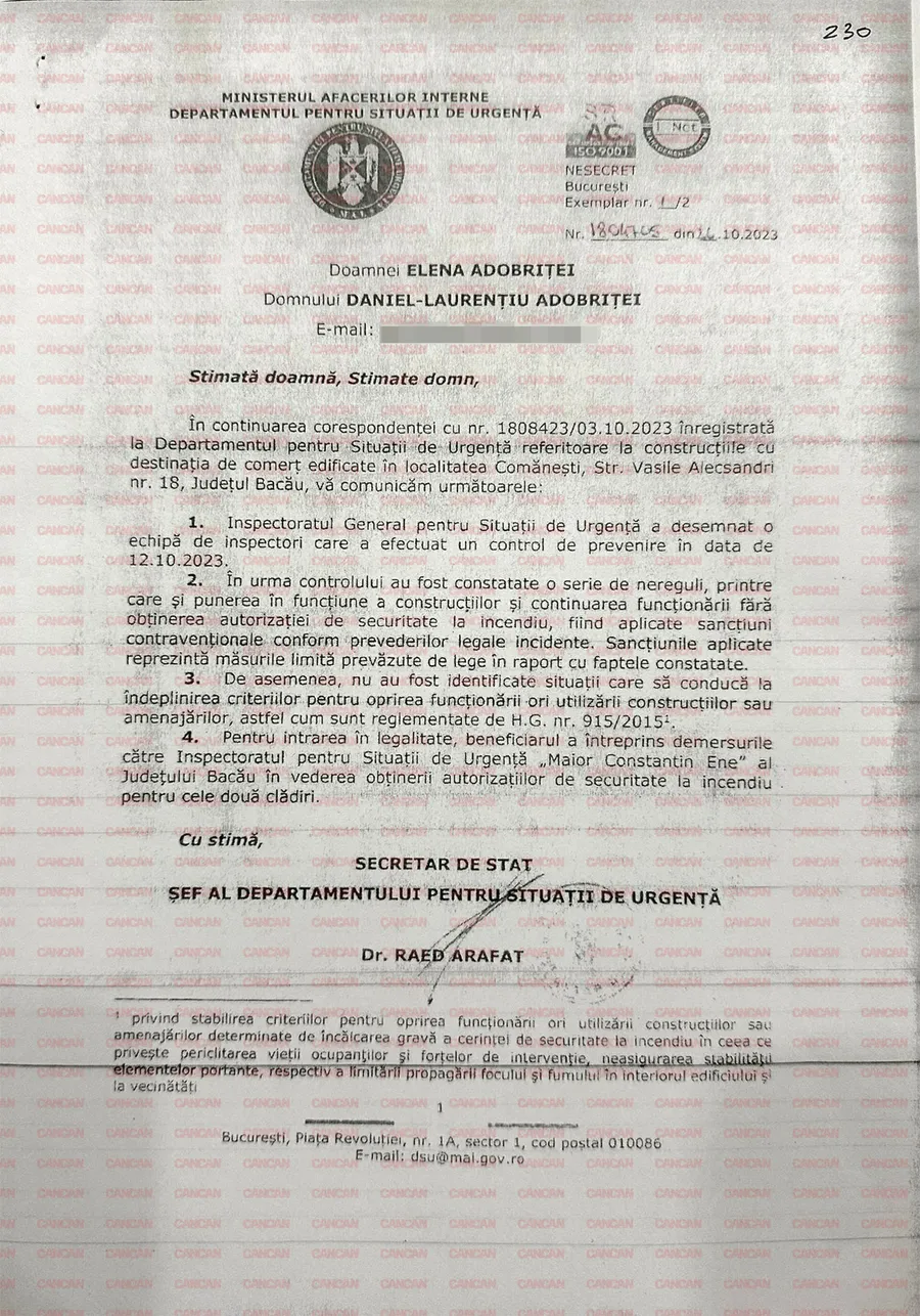 „În urma controlului au fost constatate o serie de nereguli, printre care și punerea în funcțiune a construcțiilor și continuarea funcționării fără obținerea autorizației de securitate de incendiu, fiind aplicate sancțiuni contravenționale conform prevederilor legale incidente”.