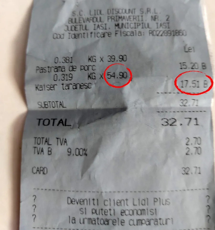 Surpriza a venit însă la casă, unde, odată scanat, suma pentru kaiser a crescut! Prețul pe kilogram s-a schimbat brusc și fără explicație, de la 39,90 lei/kg la 54,90 lei/kg, ceea ce a făcut ca bucata care trebuia să coste 12,73 lei să fie, de fapt, taxată cu 17,51 lei, cu aproape 5 lei mai mult decât era afișat inițial.
