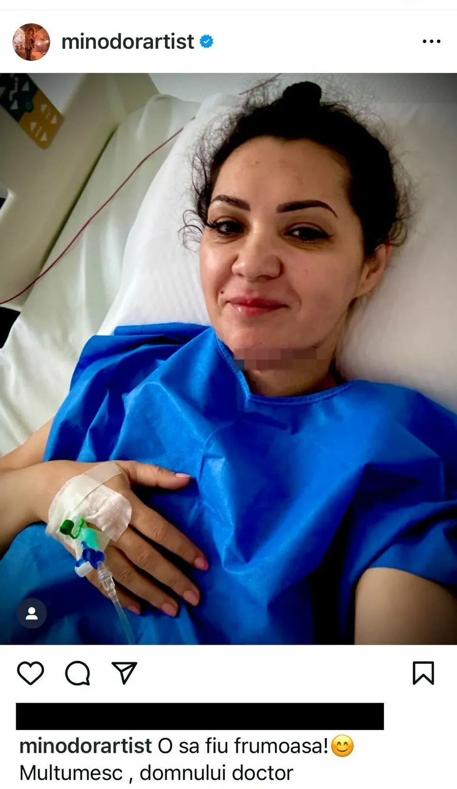 „O să fiu frumoasă! Mulțumesc domnului doctor. Sinceră și transparentă cu voi, pentru că vă respect! Mi-am scos gușa care atârna, arăta inestetic, deoarece am slăbit 40 de kg!”, a scris Minodora pe rețelele de socializare.