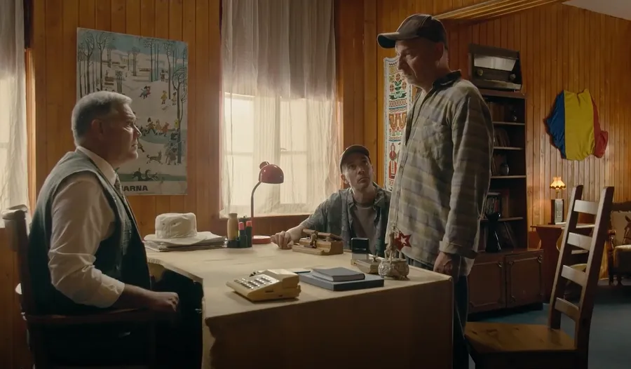 Personajele, doi săteni, discută cu un aer de convingere aproape patriotic, în biroul primarului Vasile (interpretat de Gheorghe Ifrim).