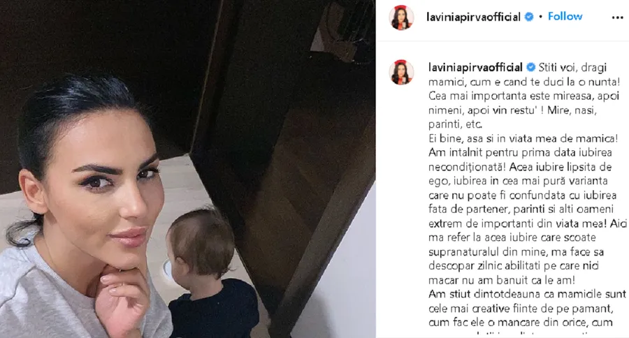 Am stiut dintotdeauna ca mamicile sunt cele mai creative fiinte de pe pamant, cum fac ele o mancare din orice, cum gasesc solutii imediate, cum actioneaza instinctiv inainte ca pericolul sa apara, insa, ce nu am stiut este faptul ca un omulet atat de mic poate sa schimbe o lume intreaga in ochii mei! Nimic din ce era nu mai este la fel, toate astea datorita lui!” , a scris Lavinia Pîrva pe Instagram.