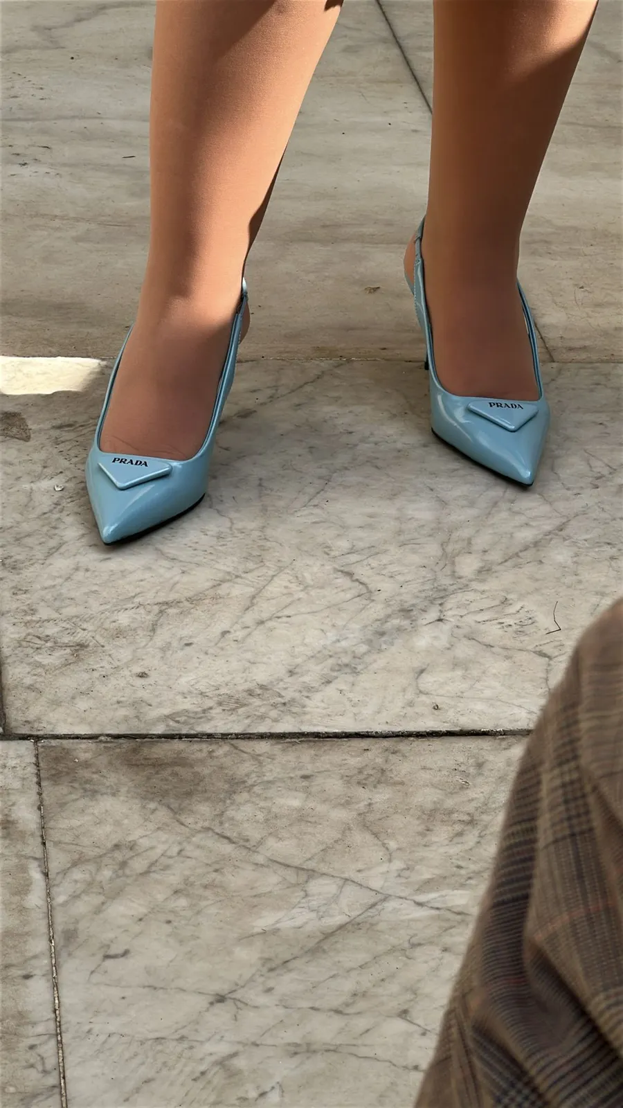 Pantofii sunt prevăzuți cu toc mediu, subțire, care completează armonios forma piciorului, și curelușă reglabilă în spate, specifică designului slingback. Culoarea albastru deschis conferă ținutei un accent subtil, dar sofisticat, care se remarcă într-un context formal precum o ședință guvernamentală. Materialul de piele lucioasă reflectă lumina naturală și artificială din sală, scoțând în evidență textura fină și calitatea premium a produsului.