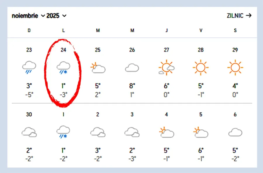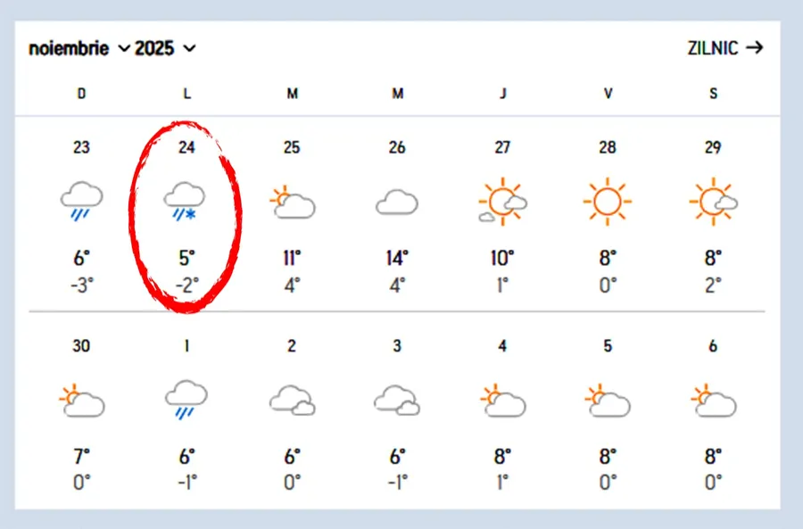 De asemenea, specialiștii Accuweather au anunțat ploi abundente duminică, 23 noiembrie 2025. Pe timpul zilei, termometrul va arăta 3 grade Celsius, iar seara va aduce temperaturi de -5 grade Celsius.