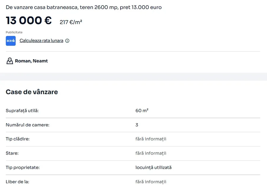 „De vânzare casă bătrânească, situată pe un teren de 2600mp, în comuna Valea Ursului, Neamț. Casa este construită din chirpici, are 3 camere și un hol, plus o bucătărie de vară, are fântână, beci, anexe pentru animale, viță de vie și mulți pomi fructiferi. Preț 13.000€”, se arată în anunțul de vânzare.