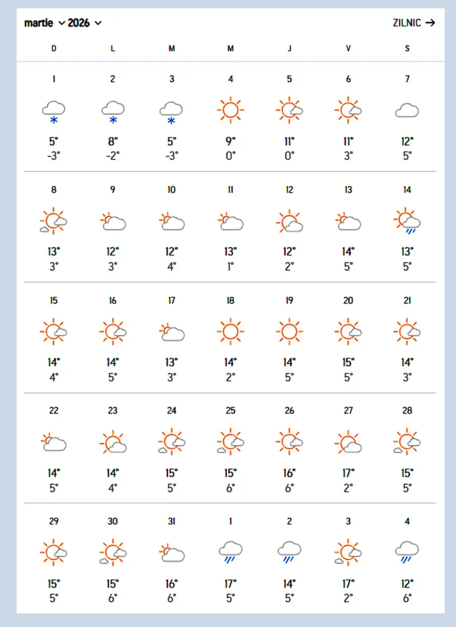 Prognoza detaliată pentru București arată o lună marcată de fluctuații puternice. În primele zile, temperaturile maxime abia ating 5–9 grade, iar minimele coboară sub zero. Ninsoarea apare în mai multe rânduri, un lucru surprinzător pentru Capitală, unde astfel de episoade au devenit excepții.