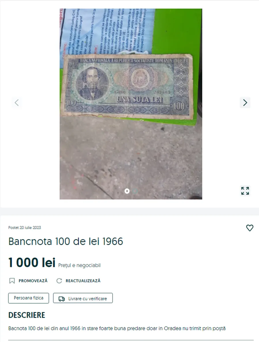 „Bancnotă 100 de lei din anul 1966, în stare foarte bună, predare doar în Oradea, nu trimit prin poștă”, se arată în anunțul respectiv.