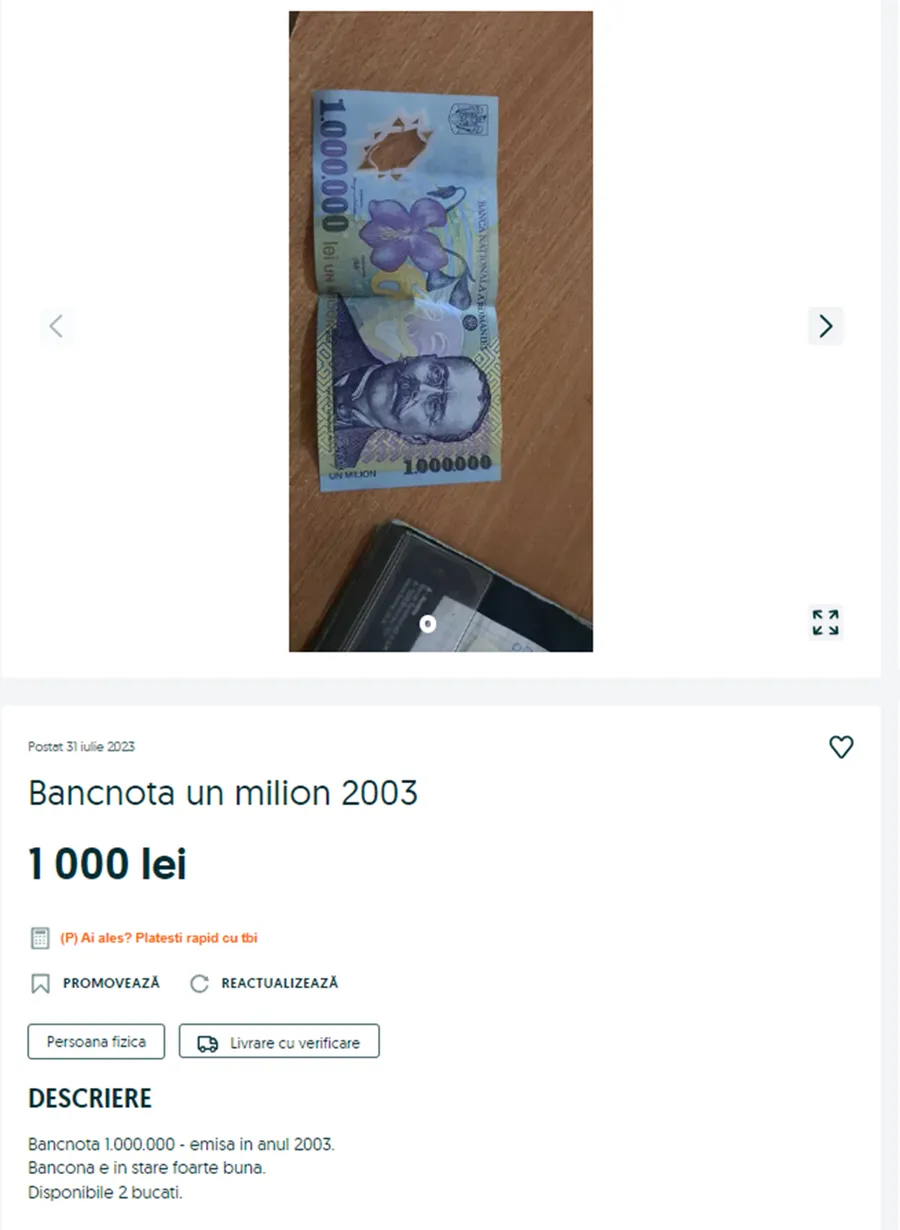 În luna decembrie a anului 2003, BNR avea să emită faimoasa bancnotă de un milion. Emisiunea pe polimer are pe avers portretul scriitorului Ion Luca Caragiale, privit din față. Tot în anul respectiv, au fost retrase din circulație bancnotele de 50.000 de lei (emisiunea 2000) și cele cu valoarea nominală de 100.000 de lei (emisiunea 1998). Pe platforma OLX, un utilizator oferă spre vânzare o bancnotă de un milion, fiind în stare foarte bună. În dreptul anunțului, a atașat o imagine cu bancnota ce urmează a fi vândută.