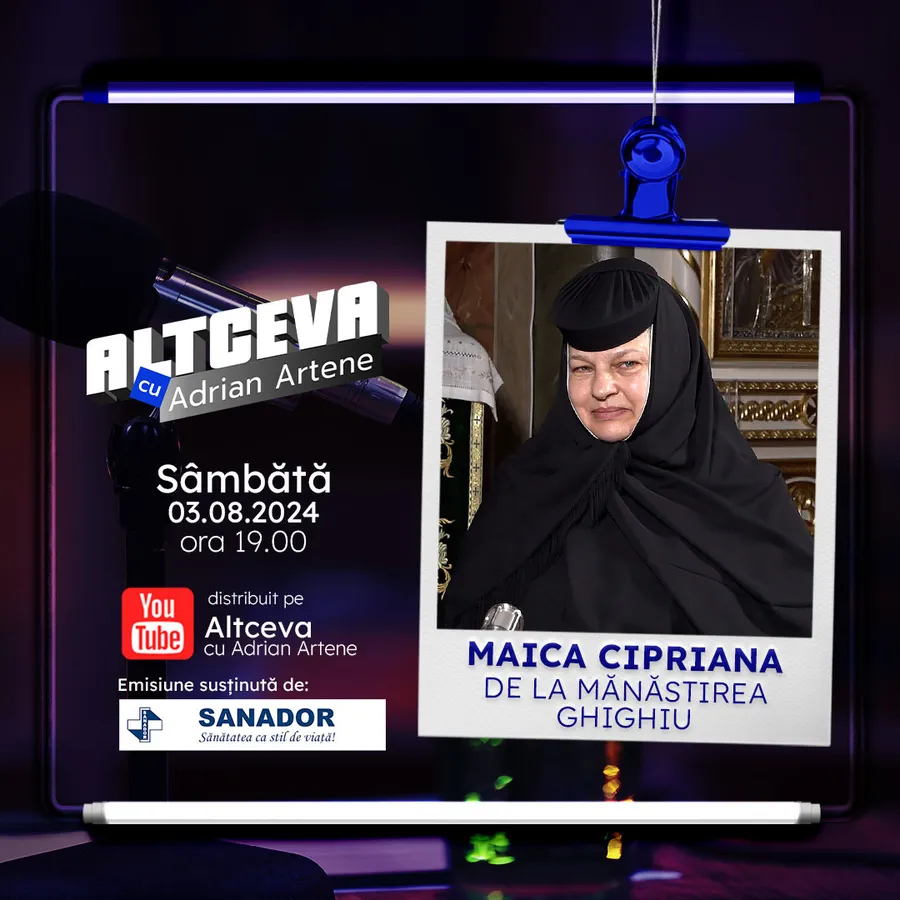 Jurnalistul Adrian Artene propune și pentru această săptămână un episod care își va face ușor loc în inimile noastre și va rămâne, acolo, pe lista favoritelor spre ascultare pe Youtube. Povestea „Altceva cu Adrian Artene” care va avea premieră sâmbătă, 3 august, pe canalul oficial o are în prim plan pe Maica Cipriana de la Ghighiu, un om ALES care a ALES să ne împărtășească minuni pe care le-a trăit și pe care a avut privilegiul să le vadă întâmplându-se în lăcașul de cult care îi este casă de mulți ani.