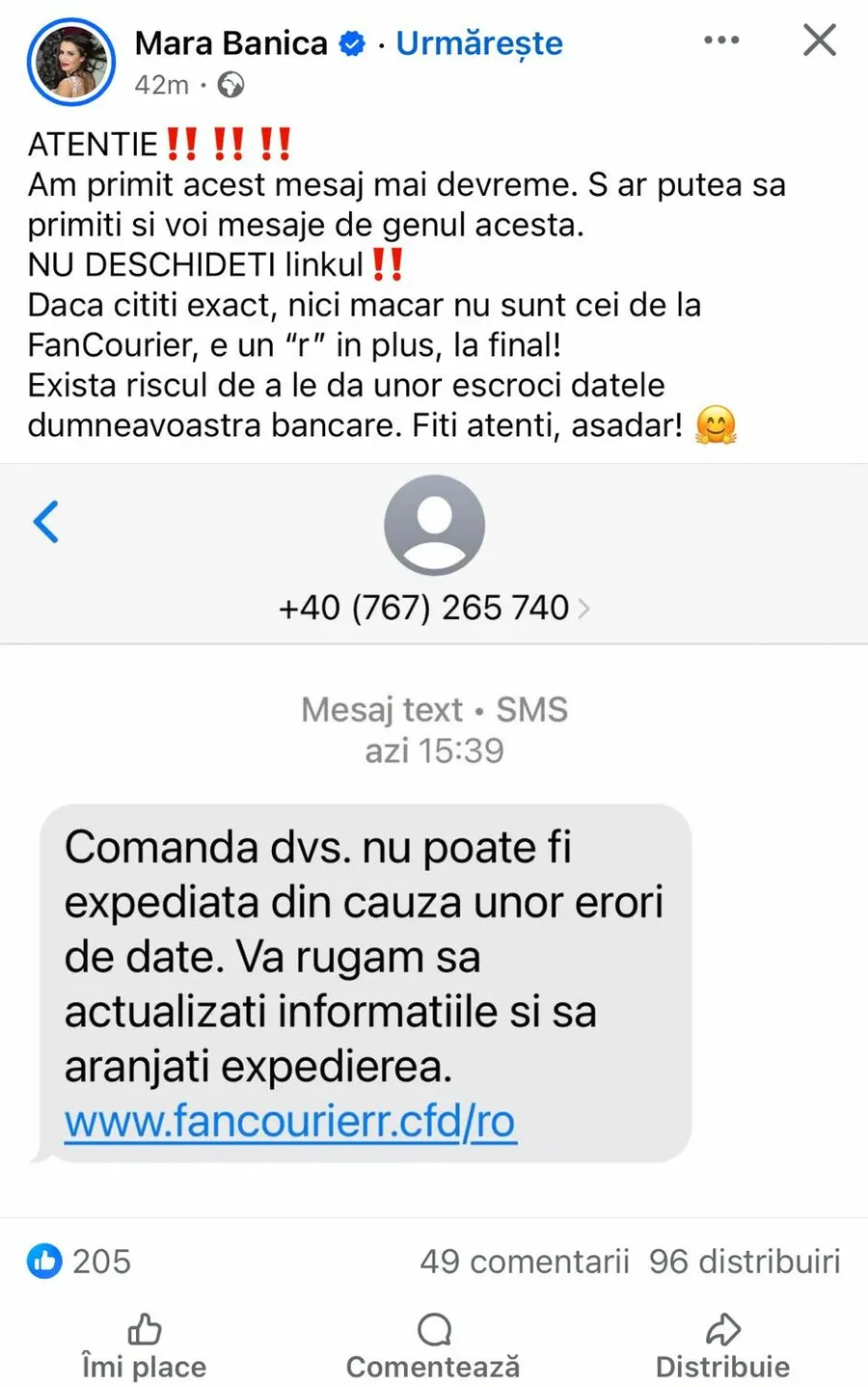 Dacă citiți exact, nici măcar nu sunt cei de la FanCourier, e un ”r” în plus, la final! Există riscul de a le da unor escroci datele dumneavoastră bancare. Fiți atenți, așadar!”, a scria Mara Bănică pe o rețea de socializare.