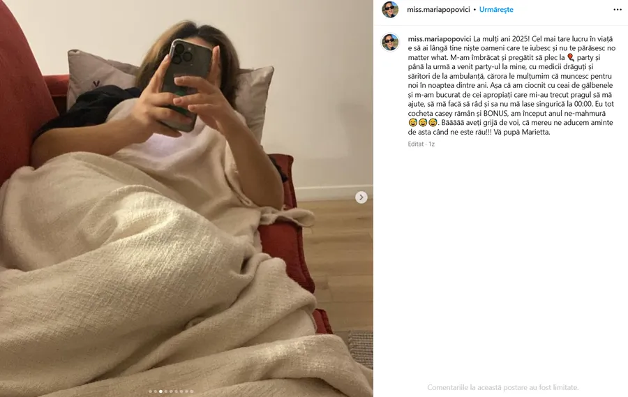 Ulterior, Maria Popovici a făcut o postare în care a ținut să le mulțumească prietenilor săi pentru că i-au fost alături. Totodată, în stilul caracteristic, comedianta a făcut haz de necaz, povestind cum a petrecut Revelionul.