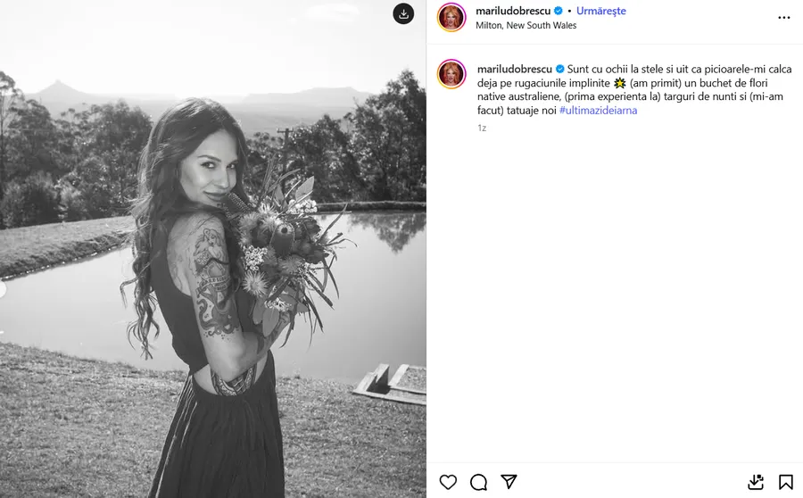 „Sunt cu ochii la stele și uit că picioarele-mi calcă deja pe rugăciunile împlinite. Am primit un buchet de flori native australiene, prima experiență la târguri de nunți”, a scris Marilu pe Instagram.