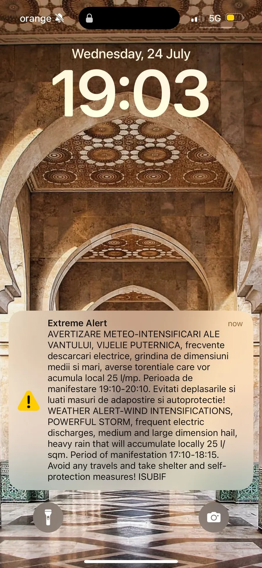 ANM a emis cod portocaliu pentru municipiul București, valabil până la ora 20:10. Se vor semnala: Averse torențiale care vor acumula 25…40 l/mp, frecvente descărcări electrice, intensificări ale vântului, grindină.