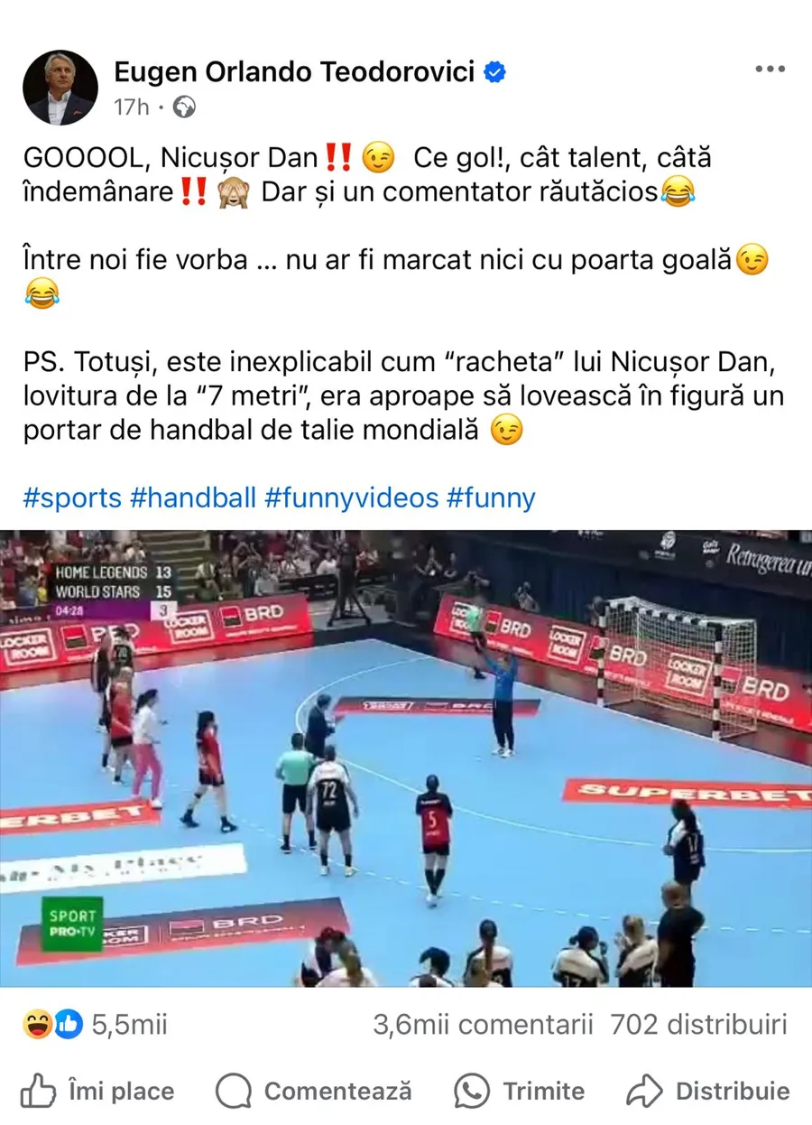 „Gooool, Nicușor Dan! Ce gol, cât talent, câtă îndemânare! Dar și un comentator răutăcios. Între noi fie vorba… nu ar fi marcat nici cu poarta goală. P.S. Totuși, este inexplicabil cum «racheta» lui Nicușor Dan, lovitura de la «7 metri», era aproape să lovească în figură un portar de handbal de talie mondială”, a comentat fostul ministrul al Finanțelor pe Facebook.