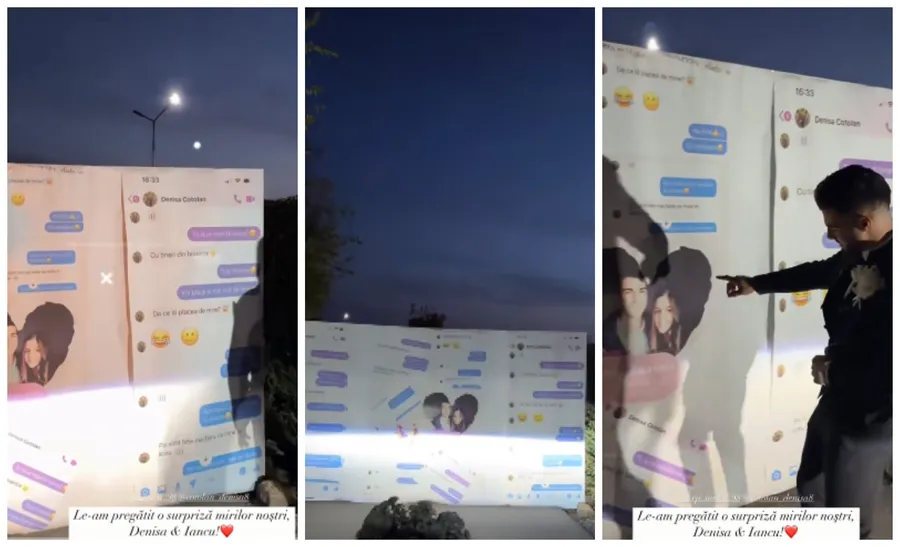 Așa cum spuneam, Iancu Sterp și Denisa Coțolan au avut parte de o surpriză neașteptată la nunta lor. Prietenii cuplului au vrut să le readucă aminte celor doi că iubirea lor datează de ani de zile, așa că la intrarea în restaurantul de la Domeniile Streiului au fost amplasate câteva pancarte pe care se regăseau mesajele private dintre Iancu și Denisa de la primele tatonări.