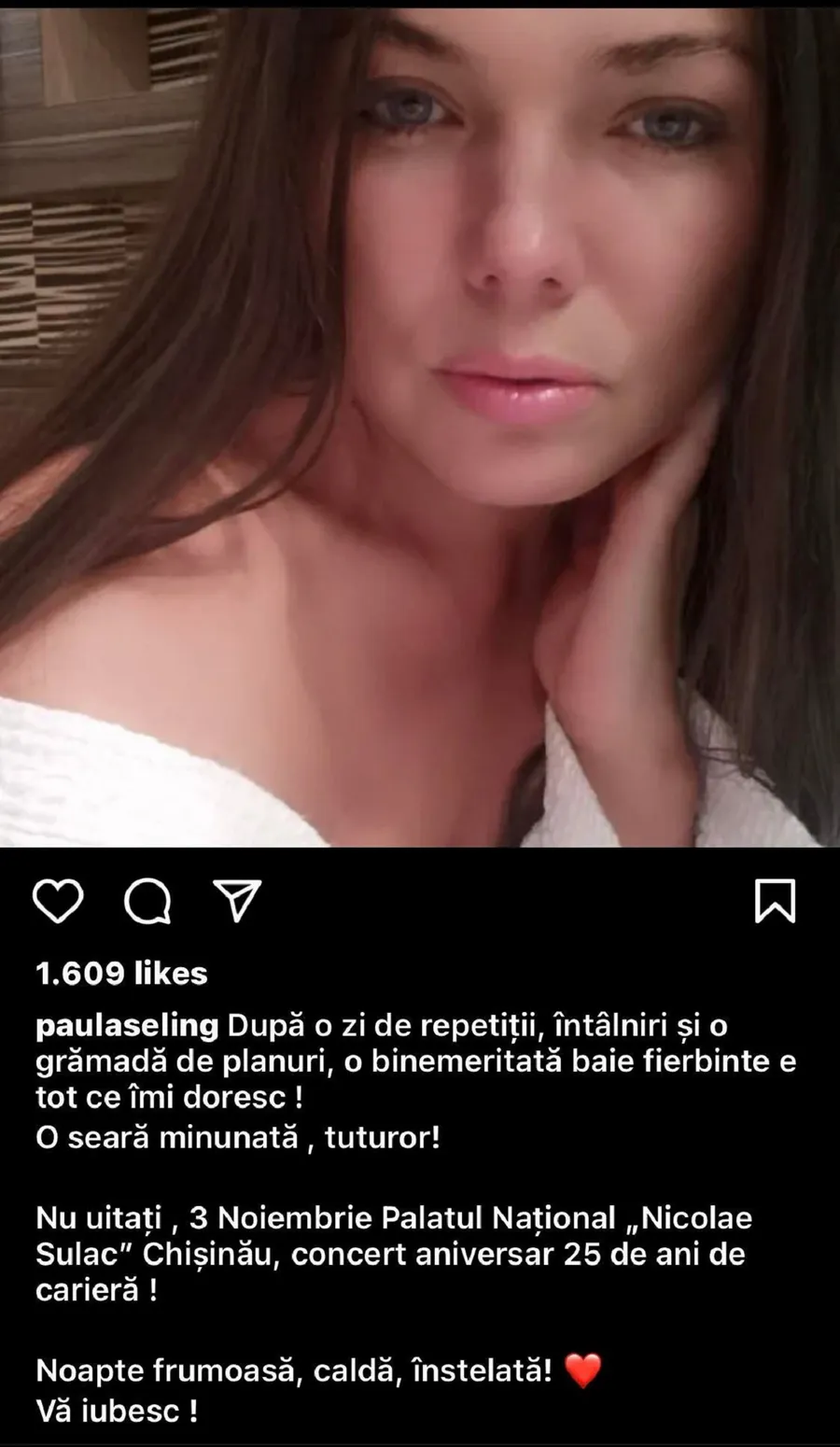 Nu uitați, pe 3 noiembrie la Palatul Național ‘Nicolae Sulac’ din Chișinău, concert aniversar 25 de ani de carieră. Noapte frumoasă, caldă, înstelată! Vă iubesc!”, a scris Paula Seling, pe Instagram.