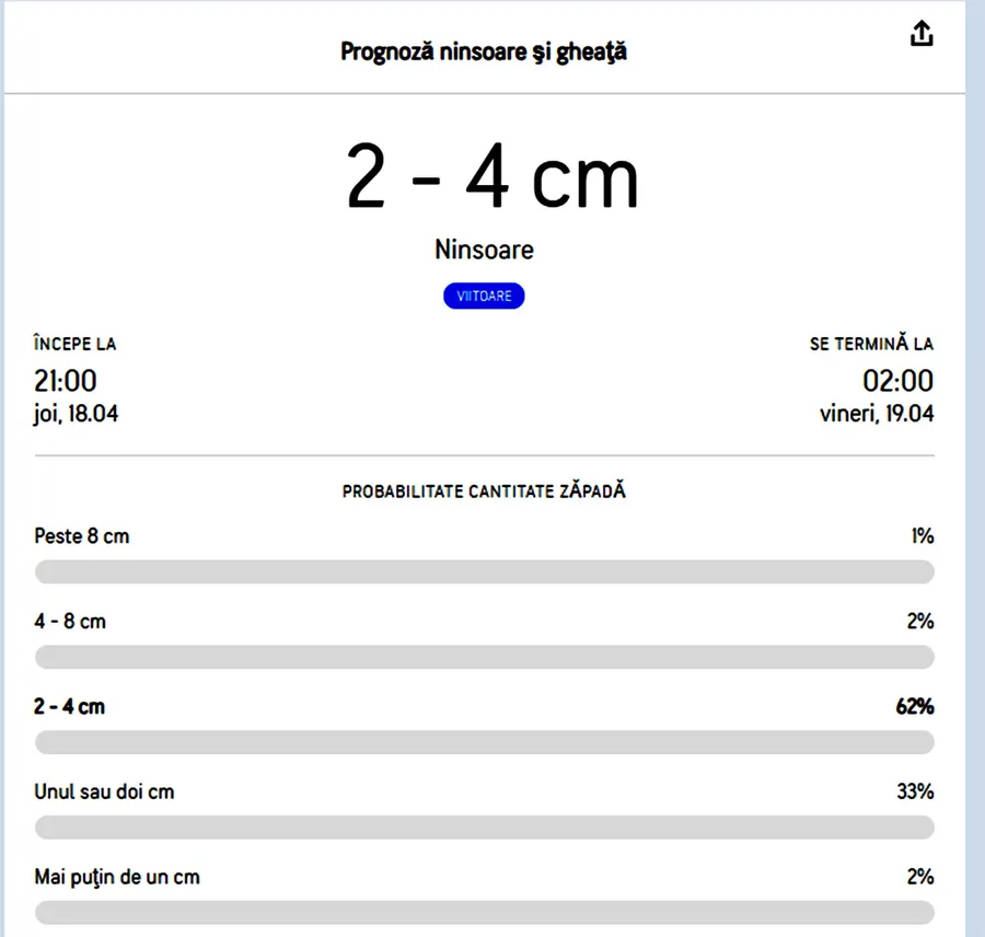 Potrivit informațiilor oferite, alerta pentru ninsoare severă este valabilă în intervalul joi (17 aprilie), ora 21:00 – vineri (18 aprilie), ora 02:00. În acest interval, în zona Predeal se vor înregistra ninsori abundente.