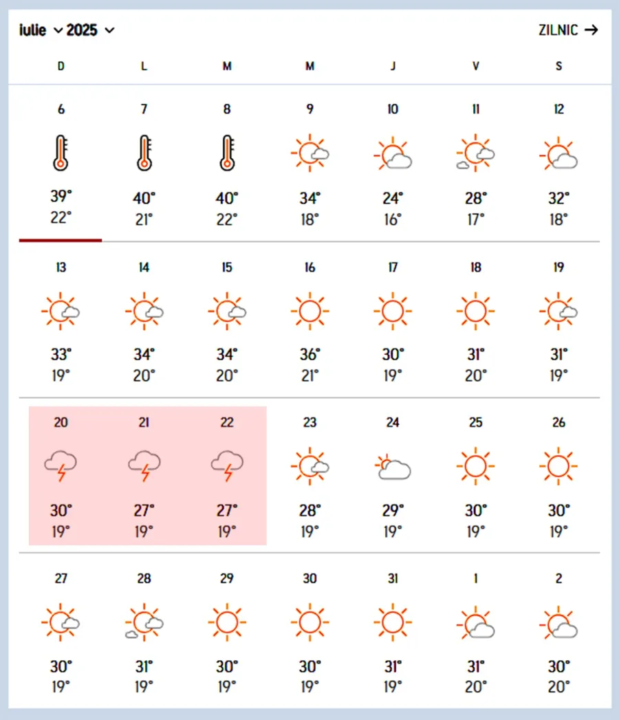 Prognoza evidențiază o tendință clară de instabilitate atmosferică începând cu data de 20 iulie, când vremea va deveni brusc instabilă, după o perioadă în care temperaturile au variat între 30 și 36 de grade, cu cer predominant senin. Această tranziție de la o perioadă de caniculă la una de furtuni poate avea implicații asupra activităților zilnice, a traficului urban și a evenimentelor programate în aer liber.