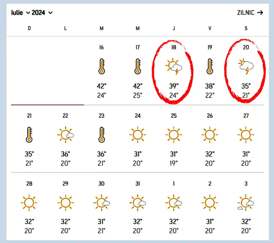 La fel se menține vremea în București și în ultimele zile din luna iulie. Meteorologii Accuweather au anunțat maxime de 31 – 32 de grade Celsius, iar minimele vor fi de 20 – 21 de grade Celsius.