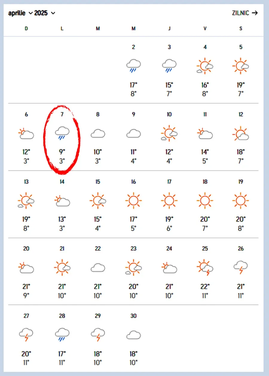 Ultima săptămână a lunii aprilie aduce temperaturi normale pentru sezon, cu valori medii de 16-18 grade ziua și minime de peste 5 grade noaptea. Șansele de ploaie sunt reduse, iar vremea pare să revină, în sfârșit, la un aspect de primăvară adevărată.