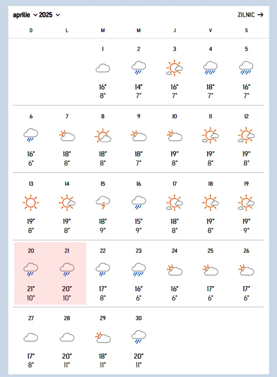 Dacă luna martie a surprins prin valori maxime record de 29-30 de grade Celsius, aprilie nu va depăși 18-19 grade, iar spre finalul lunii minimele vor coborî până la 6 grade pe timp de noapte. În plus, se anunță o perioadă foarte ploioasă, cu episoade de precipitații care ar putea influența semnificativ activitățile în aer liber.