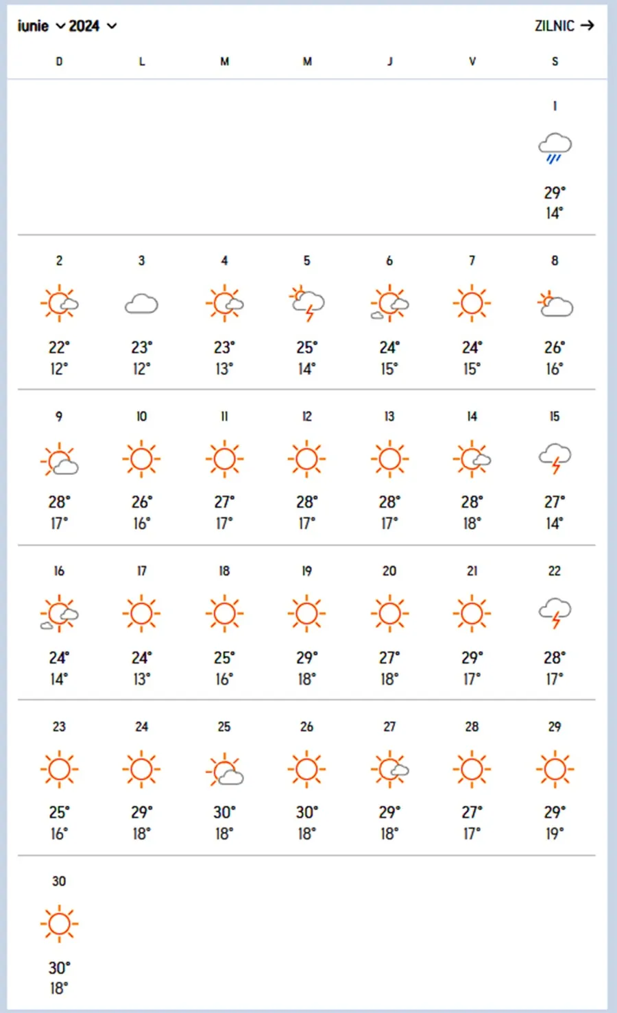 În a doua jumătate a lunii iunie se schimbă lucrurile. Valorile termice vor urca peste media celor normale în acea perioadă, dar și peste temperaturile care vor fi în luna iulie 2024. Luna lui Cuptor nu va fi la fel de călduroasă precum în anii trecuți. Se pare că sfârșitul lui iunie va fi mult mai însorit, cu temperaturi mai mari, decât iulie.