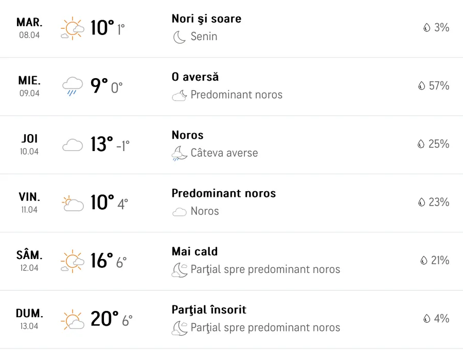 Cu toate acestea, datele meteorologice pentru perioada următoare oferă o perspectivă mai optimistă. Potrivit analizelor realizate de specialiști, vremea urmează să se încălzească treptat în următoarele zile, iar temperaturile vor cunoaște o creștere semnificativă pe măsură ce ne apropiem de mijlocul lunii aprilie. Astfel, sfârșitul acestei săptămâni ar putea marca începutul unei perioade cu caracteristici mai apropiate de primăvară, cu maxime termice care ar putea depăși frecvent 16-20 de grade Celsius, în special în sudul și vestul țării.
