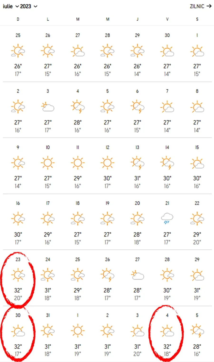 În Capitală, vremea va fi destul de călduroasă pe tot parcursul lunii iulie, însă nu vom fi nevoiți să ne luptăm cu canicula. Temperaturile vor oscila între 26 și 31 de grade, iar cele mai călduroase zile vor fi pe data de 23 și 30 iulie, când maxima va fi de 32 de grade. Pe de altă parte, chiar dacă este denumită „luna lui cuptor”, începutul lui august debutează cu temperaturi cuprinse între 31-32 de grade, deci nu ne vom confrunta cu o vară secetoasă, așa cum s-a întâmplat ani la rând.