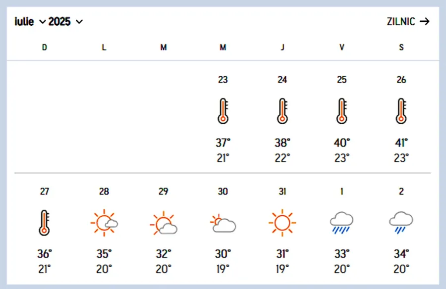 Meteorologii Accuweather au actualizat prognoza pentru perioada următoare, iar canicula își va face simțită prezența în aceste zile. Între 23 și 27 iulie, specialiștii au anunțat temperaturi ridicate, cuprinse între 37 și 41 de grade Celsius.