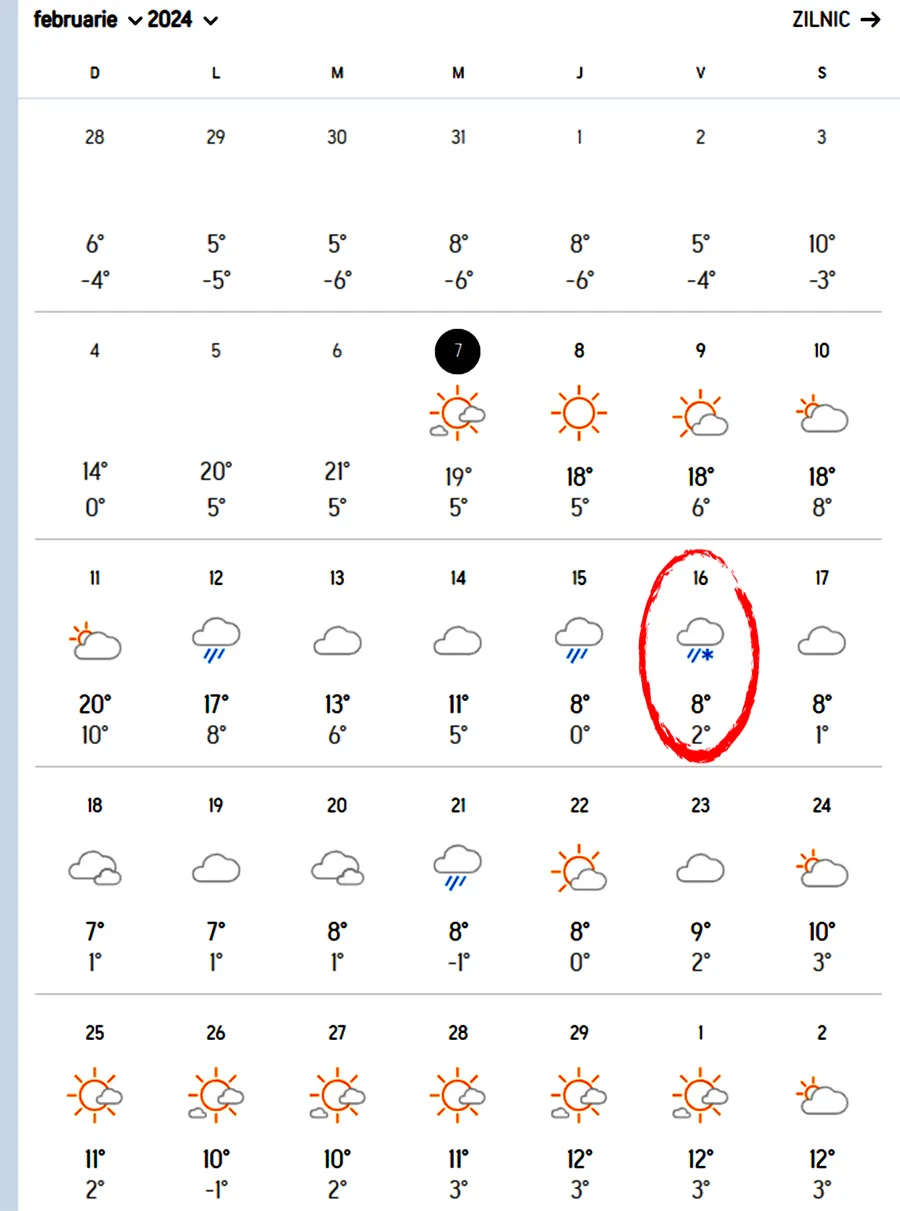 - 8 februarie 2024 – maxima de 18 grade Celsius, minima de 5 grade Celsius;