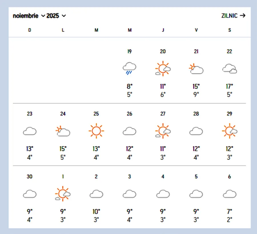 Prognoza pentru următoarele două săptămâni arată un tablou meteorologic atipic. După ploaie și răcoare, soarele își face loc treptat printre nori, iar în mai multe zile cerul va rămâne parțial senin. Temperaturile vor oscila între 11 și 17 grade în perioada 20–29 noiembrie, valori care, în mod normal, ar fi caracteristice pentru finalul lunii octombrie. Minimele nocturne se mențin și ele la cote ridicate, în jur de 4–9 grade Celsius, ceea ce contribuie la senzația de vreme blândă.