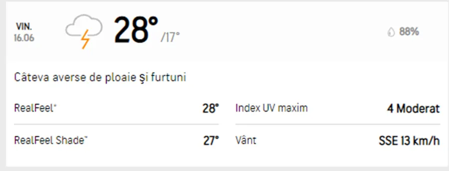 Meteorologii Accuweather au schimbat prognoza și anunță o vreme răcoroasă în acest weekend, în Capitală. Vremea începe să se răcească treptat, iar vineri, 16 iunie, cerul o să fie unul înnorat, iar vântul o să își facă și el simțită prezența. De asemenea, se anunță condiții de ploaie, meteorologii prognozând averse și furtuni. În privința valorilor termice, temperaturile maxime nu o să depășească 28 de grade, iar cele minime vor coborî până la 17 grade.