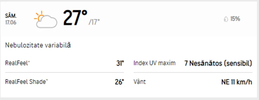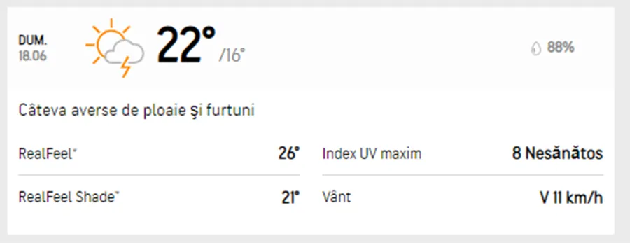 Finalul de weekend o să aducă ziua cea mai rece. Pentru duminică, 18 iunie, meteorologii Accuweather anunță temperaturi destul de scăzute pentru această perioadă a anului. Temperaturile maxime nu o să depășească 22 de grade, iar cele minime o să ajungă la 16 grade. Pe tot parcursul zile sunt condiții de precipitații, iar vântul va sufla și el cu 11 km/h