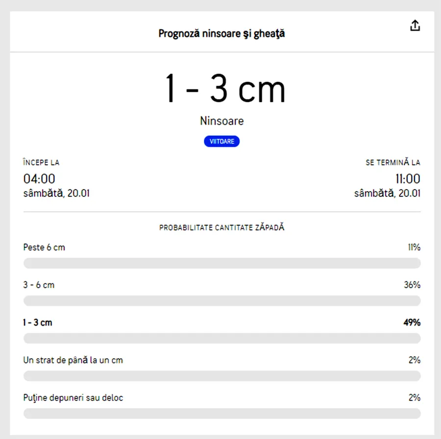 În noaptea de vineri spre sâmbătă – 19 spre 20 ianuarie 2023- sunt așteptate precipitații sub formă de lapoviță, după care ninsori. Meteorologii Accuweather au emis o avertizare meteo de vreme rea și ninsori în București. O să ningă sâmbătă, 20 ianuarie 2023, de la ora 7:00 la ora 11:00. Duminică, 21 ianuarie 2023, vremea rămâne rece cu maxime de 1-2 grade Celsius și minime apropiate de pragul înghețului.