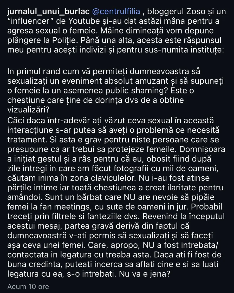 „Centrul Filia, bloggerul Zoso și un ‘influencer’ de Youtube și-au dat astăzi mâna pentru a agresa sexual o femeie. Mâine dimineață vom depune plângere la Poliție. Până una alta, acesta este răspunsul meu pentru acești indivizi și pentru sus-numita instituțe: În primul rând, cum vă permiteți dumneavoastră så sexualizați un eveniment absolut amuzant și să supuneți o femeie la un asemenea public shaming? Este o chestiune care ține de dorința dumneavoastră de a obține vizualizări?”, a scris Bendeac în incipitul mesajului.