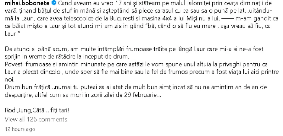 Povești frumoase și amintiri minunate pe care astăzi le vom spune unul altuia la priveghi pentru că Laur a plecat acolo, unde sper să fie mai bine sau la fel de frumos precum a fost viața lui aici printre noi. Drum bun frățică… numai tu puteai să ai atât de mult bun simț, încât să nu ne amintim an de an de despărțire, altfel cum să mori în zorii zilei de 29 februarie… Rodi, Jung, Cătă… fiți tari!”, este mesajul pe care Mihai Bobonete l-a scris pe Instagram.