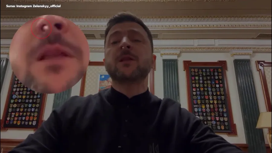 În acest context, Volodimir Zelensky a vorbit despre cele întâmplate pe contul său oficial de Instagram, unde are 16 milioane de urmăritori. Însă, atenția tuturor a fost mutată de la monologul președintelui la… nasul său. Momentul a devenit imediat viral.