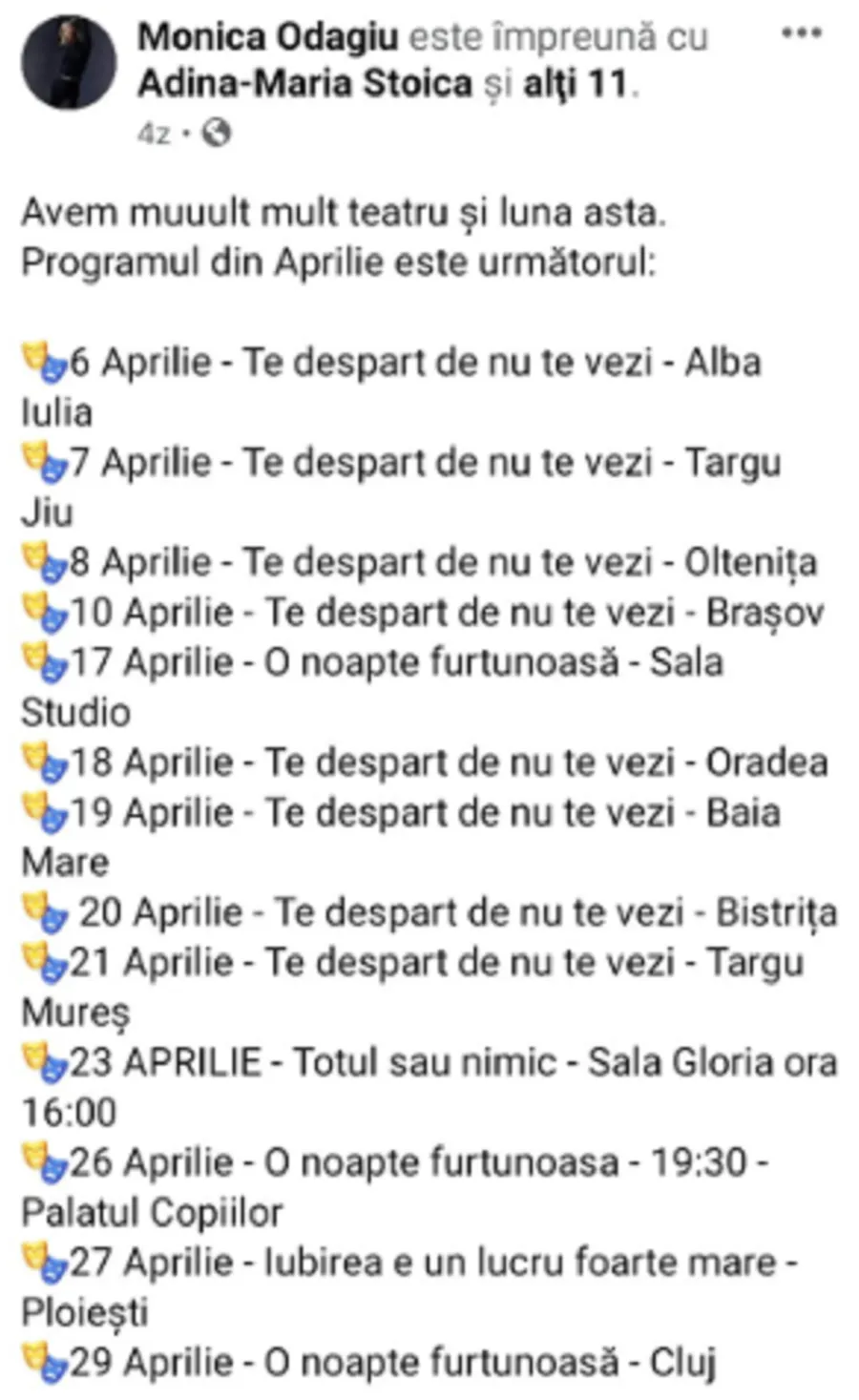 Monica Odagiu nu va fi prezentă la spectacolele programat pentru luna aprilie / (Sursa: Facebook)