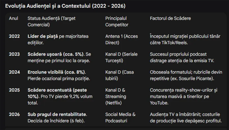 Formatul obosise, publicul spectator nu mai era cel de altădată. Nici măcar sosurile picante nu mai pișcau ca odinioară. VIP-urile ezitau să mai dea din casă, iar întrebările rămâneau în aer. Paharul de lapte era întotdeauna salvarea de moment. Cătălin Măruță însuși devenise blazat. Fizic era în platou, dar sufletul îi era în altă parte.