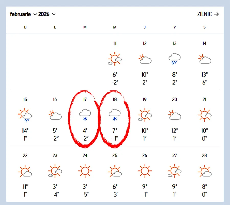 Pe 17 și 18 februarie sunt așteptate temperaturi scăzute și cer predominant noros, cu șanse ridicate de precipitații sub formă de ninsoare sau lapoviță. Vremea va fi instabilă, iar valorile termice se vor menține sub media normală a perioadei, ceea ce poate duce la depunerea unui strat de zăpadă în unele zone ale orașului și la condiții mai dificile de trafic.
