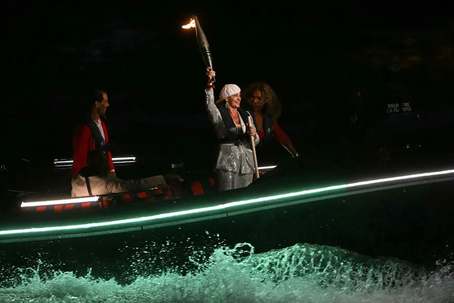 Rafael Nadal, Serena Williams, Carl Lewis și Nadia Comăneci s-au alăturat legendelor sportului francez pentru o ultimă ștafetă de echipă. Zinédine Zidane, starul fotbalului francez, a preda Torța lui Rafael Nadal, cel mai parizian dintre sportivii internaționali – cu 14 victorii la Roland Garros și dublul campion olimpic – a alergat de-a lungul Senei alături de alte legende ale sportului: Nadia Comăneci, de cinci ori campioană olimpică și deținătoarea primului 10 perfect din istoria gimnasticii la Jocurile Olimpice; Carl Lewis, considerat de unii ca fiind cel mai mare atlet cu cele 9 titluri olimpice la atletism; și Serena Williams, emblema sportului feminin și cea mai titrată campioană de Grand Slam. Nadia Comăneci și-a făcut apariția într-o ținută spectaculoasă și a strălucit la propriu într-un costum din două piese – confecționat din paiete argintii, ținuta fiind accesorizată cu o beretă în stil francez.