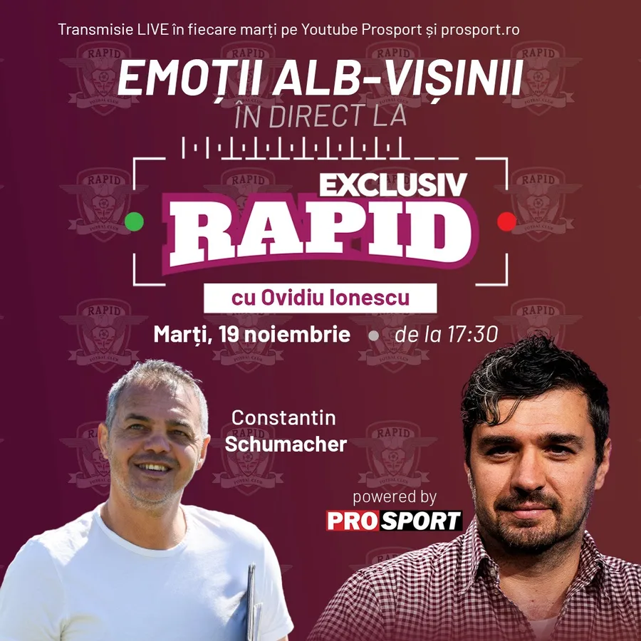 Vă așteptăm la 17:30, în direct pe canalul de YouTube – ProSport, la „EXCLUSIV RAPID”.