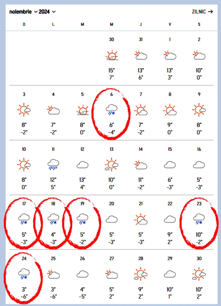 Nu va fi singura zi din noiembrie în care va ninge în Brașov. Sunt așteptate ninsori și pe 17,18,19, 23 și 24 noiembrie. Românii se vor bucura de fulgii de nea, în vacanțele pe care le au deja programate la munte. Valorile termice vor scădea și ele, iar nopțile vor fi mult mai geroase. Se vor înregistra temperaturi cu minus, în majoritatea nopților din luna noiembrie. Este clar că iarna vine mai repede decât ne-am fi așteptat, cel puțin în zonele montane.