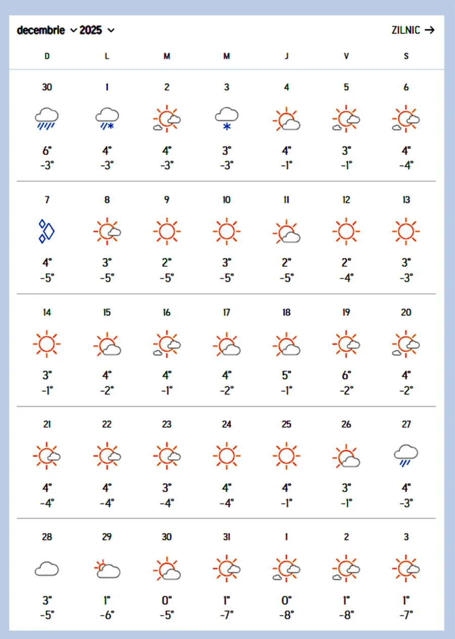 Meteorologii au mai anunțat ploaie doar în data de 27 decembrie 2025. În ultimele zile ale acestei luni, temperaturile maxime se vor încadra 0 și 3 grade Celsius, iar minimele vor fi cuprinse între -3 și -8 grade.