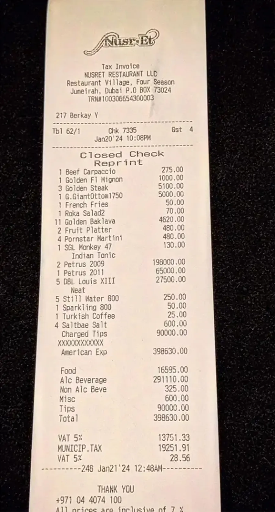 Bucătarul a postat pe rețelele de socializare o notă de plată în valoare de 108.500 de dolari. Din cei peste 54 de milioane de urmăritori au existat câțiva internauți care s-au arătat indignați de aroganța turcului.