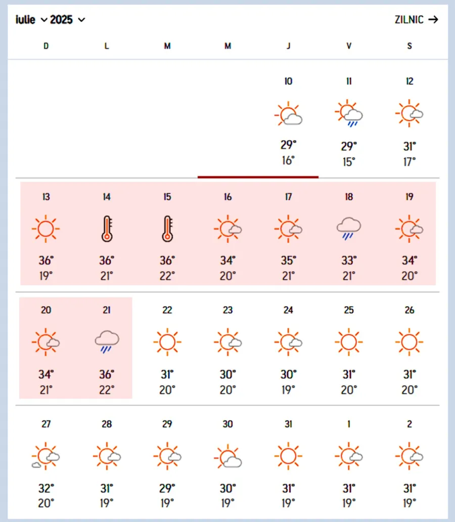 Potrivit specialiștilor, maximele vor fi de 36 de grade Celsius, iar minimele vor ajunge chiar și la 22 de grade de Celsius. Vremea se va menține foarte călduroasă timp de 9 zile, până luni, 21 iulie 2025. Ulterior, valorile termice revin la normal. Acestea vor fi cuprinse între 30 și 32 de grade pe timpul zilei.